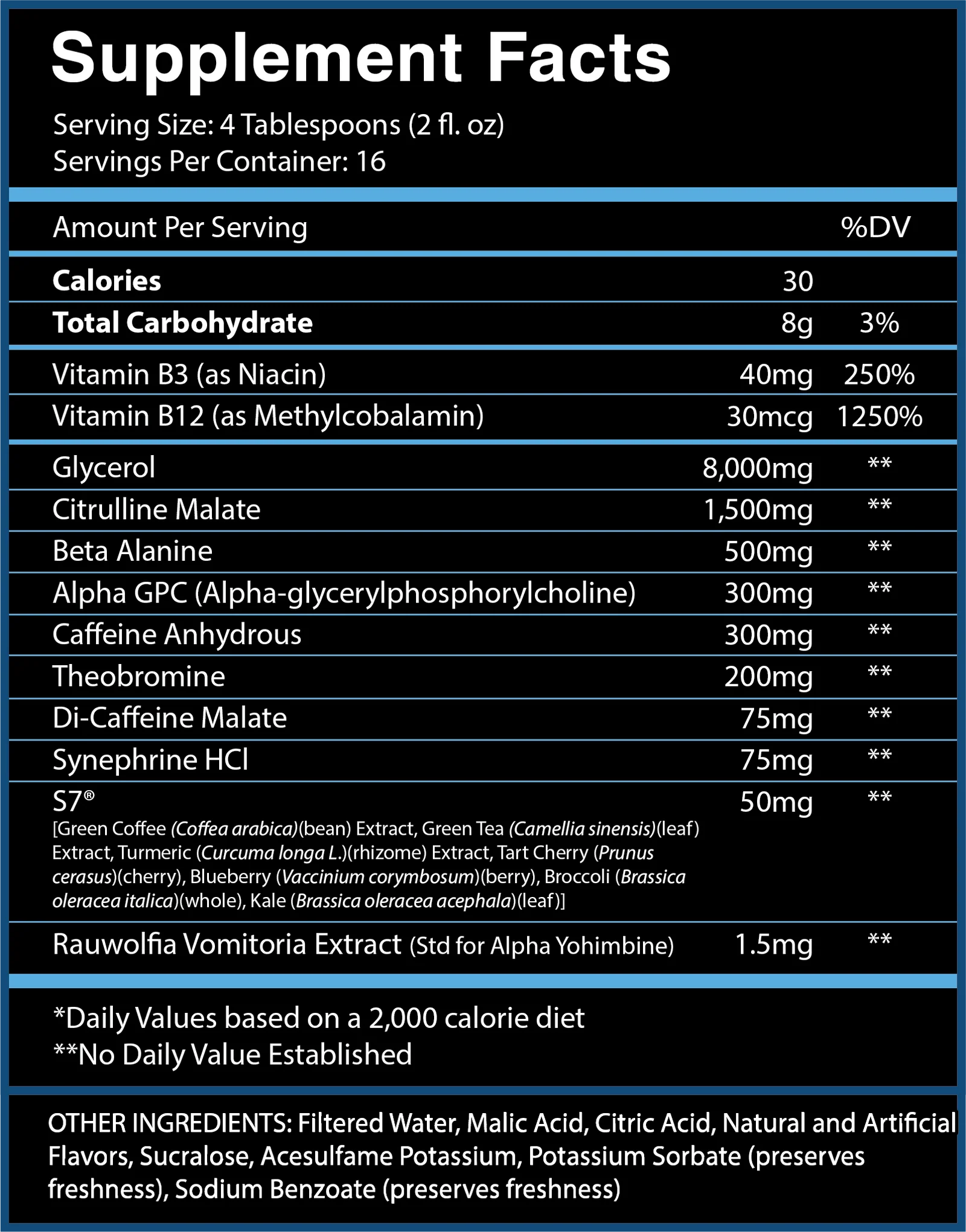 - 8,000mg of Liquid Glycerol, 1,500mg Citrulline Malate, and 50mg S7® to give you the pump of your life*