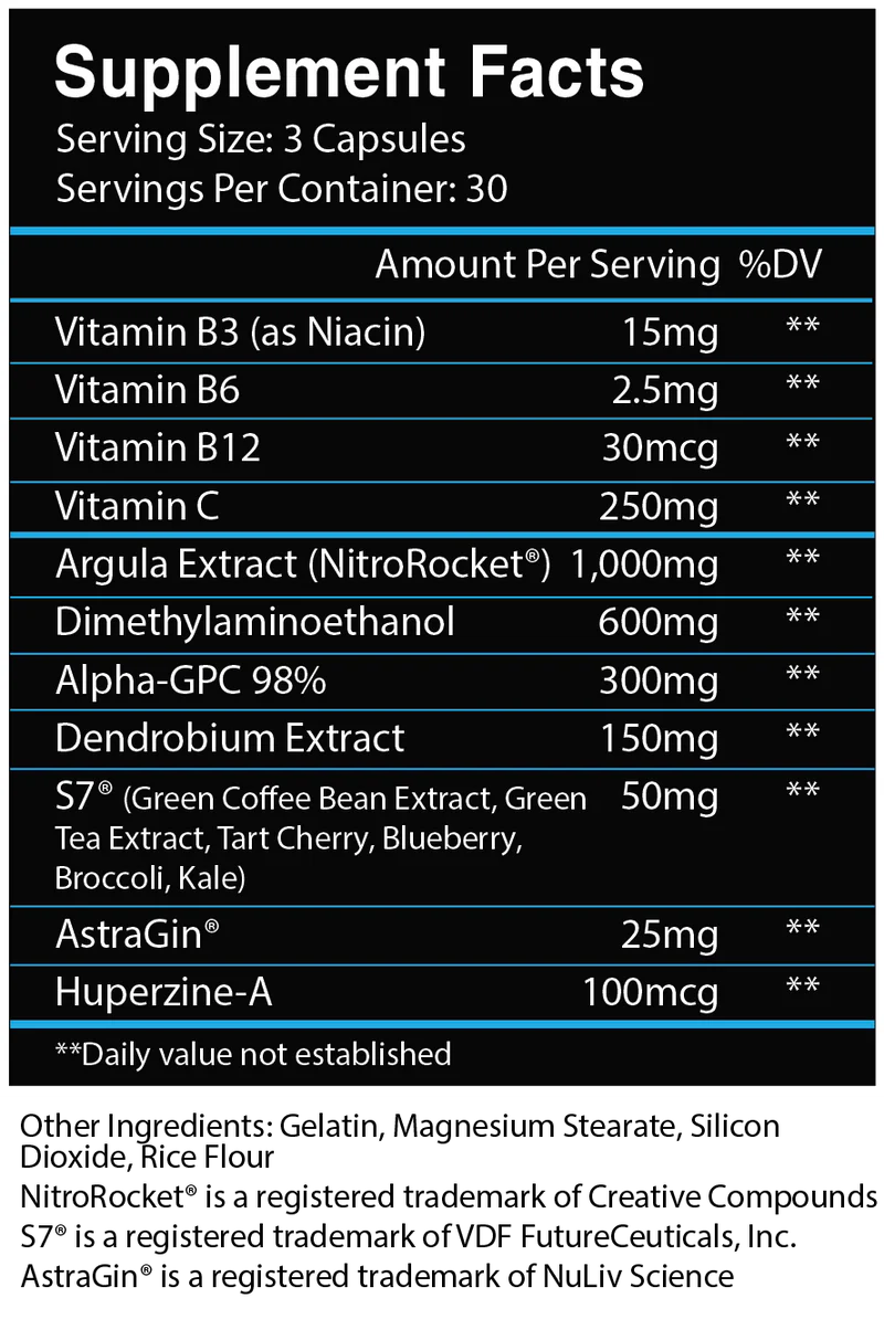 - NitriRocket® + S7® for blood flow and muscle fullness