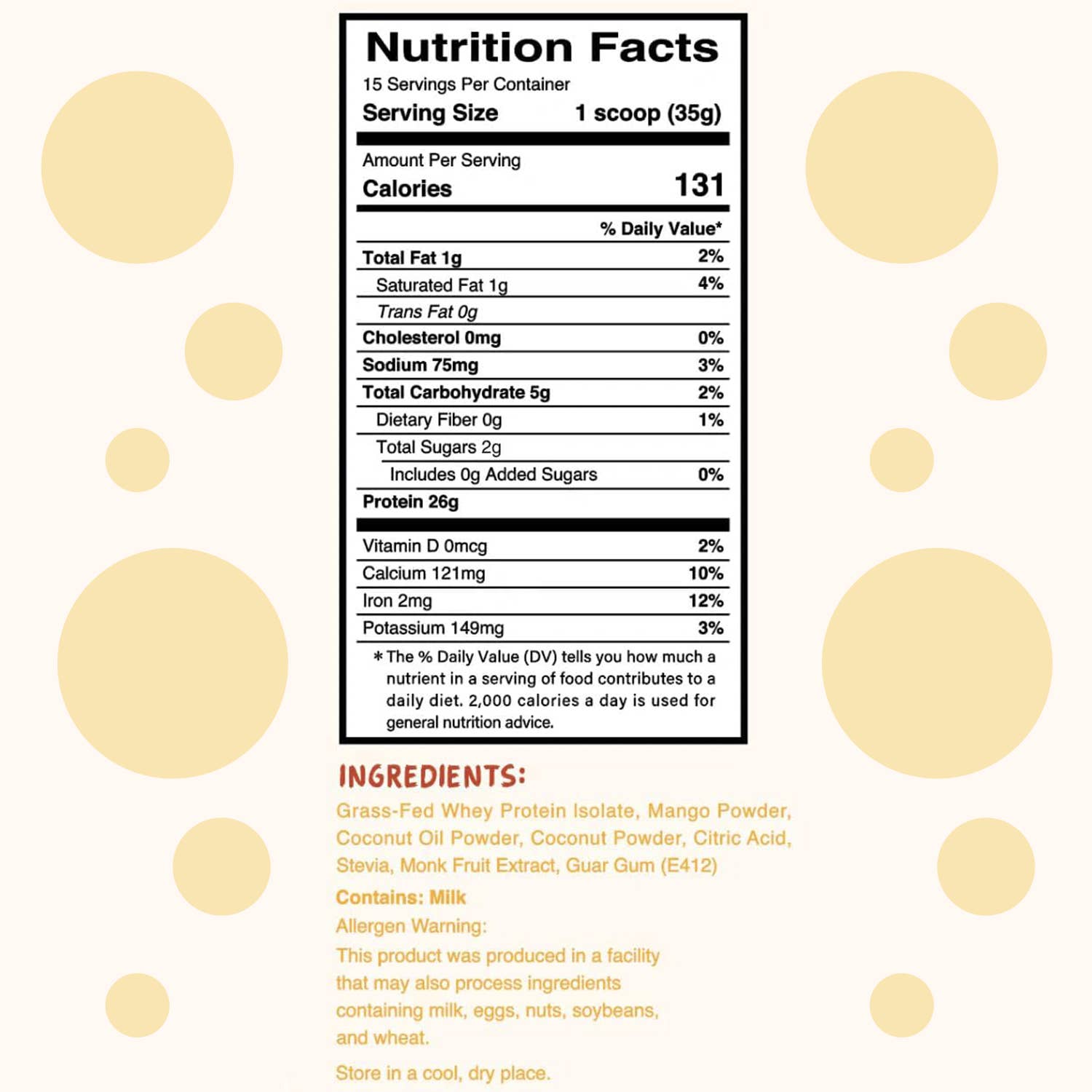 With 26 grams of grass-fed whey isolate sourced from New Zealand, and made with only real coconut and mango, indulge guilt-free in the tropical creaminess reminiscent of your favorite mango sago or mango lassi. Our coconut mango cream protein powder contains only 131 calories per serving and no added sugars or artificial ingredients, putting us amongst the leanest, cleanest, yet best-tasting protein powder on the market! So good, you would've never guessed it was a protein powder.