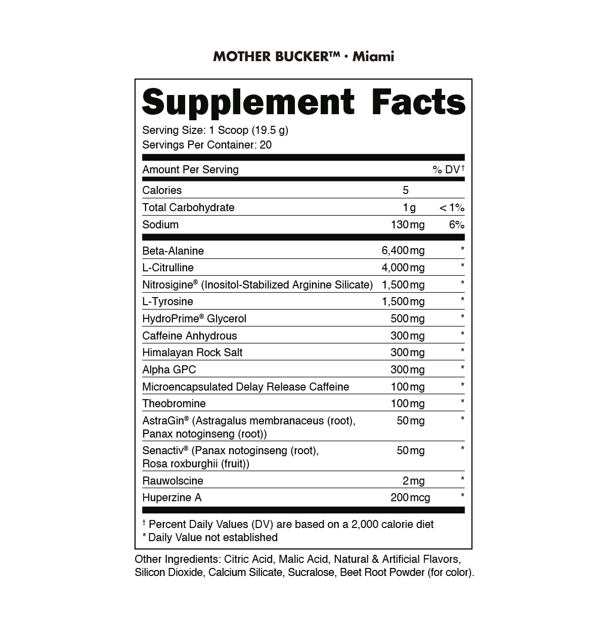 Mother Bucker Pre-Workout was designed specifically for elite stim-junkies, advanced athletes, and seasoned fitness enthusiasts. Take Mother Bucker to relive that first-time pre-workout feeling — prepare to conquer.