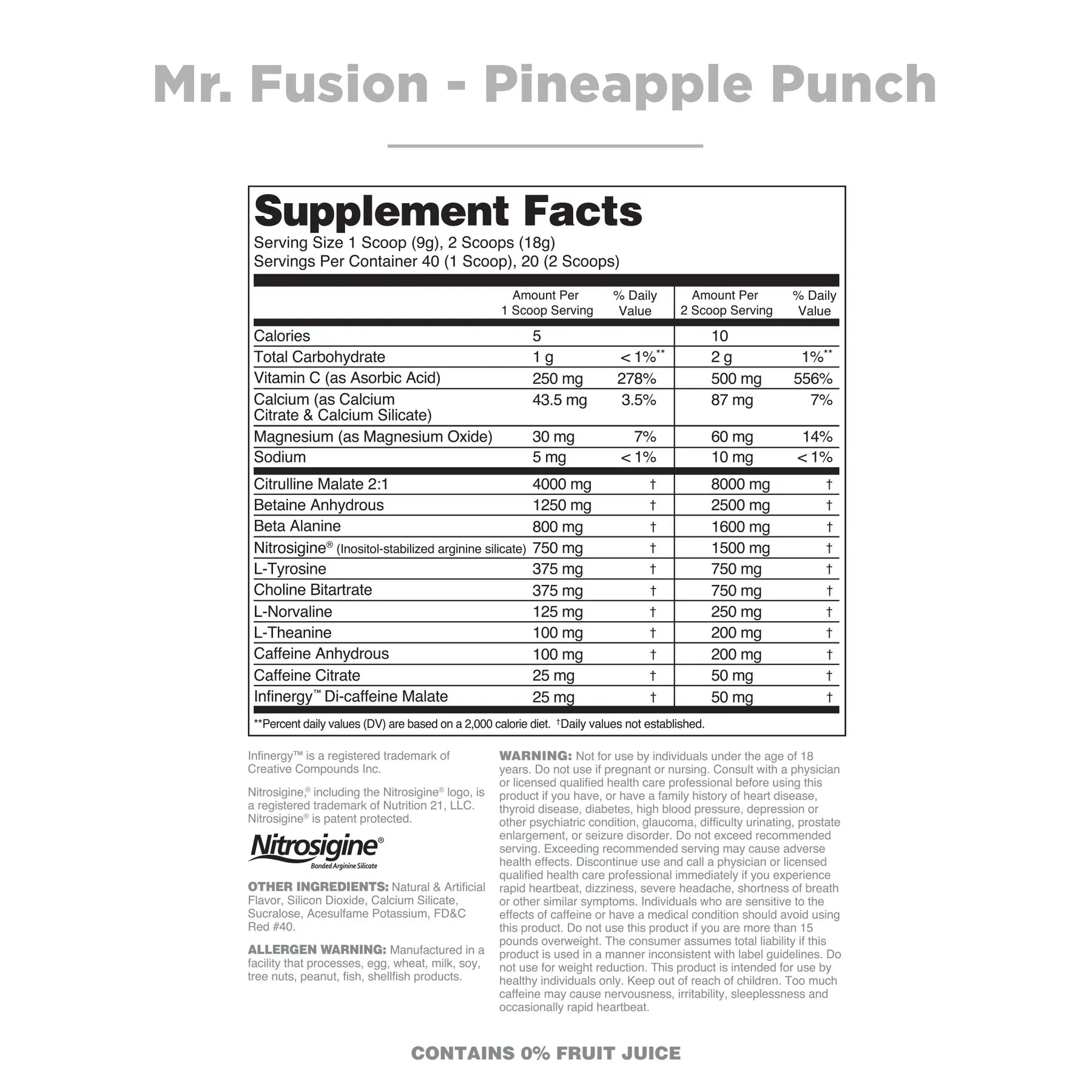 Mr. Fusion provides an incredibly clean energy while maximizing pump and endurance. You'll be more focused, energized, and perform better through your workout. The amount of caffeine and stimulants is much more mild than other pre-workouts, so you shouldn't feel a 'jittery' or anxious.