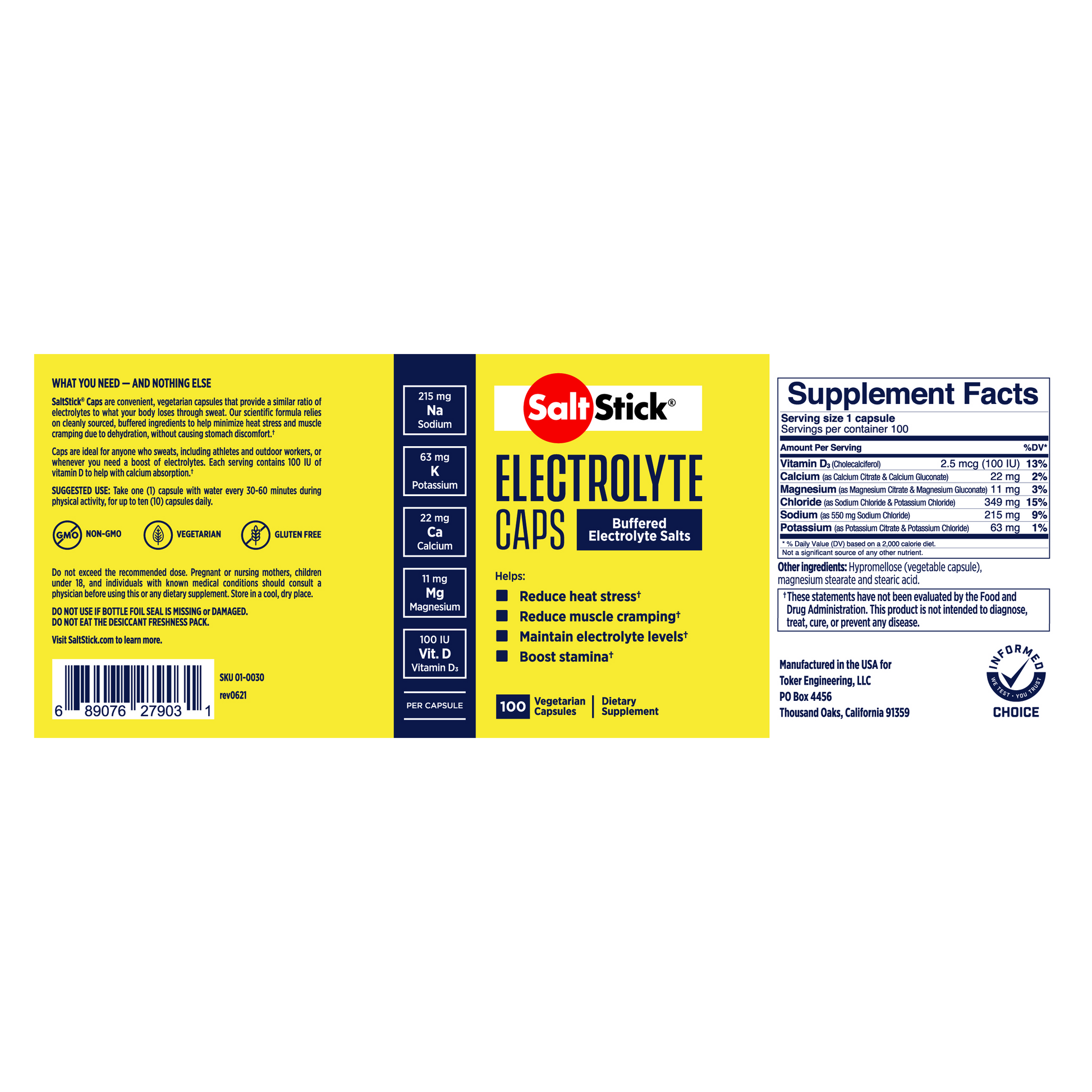 SaltStick Caps have been formulated to provide electrolytes to help minimize heat stress and muscle cramping due to perspiration, in a quantity and form which your body can absorb. This product is ideal for athletes, outdoor workers or for use in hot conditions. Two SaltStick Caps in an hour equate to 430 mg sodium, 126 mg potassium, 44 mg calcium, and 22 mg magnesium per hour, which is the ideal ratio to keep you moving.